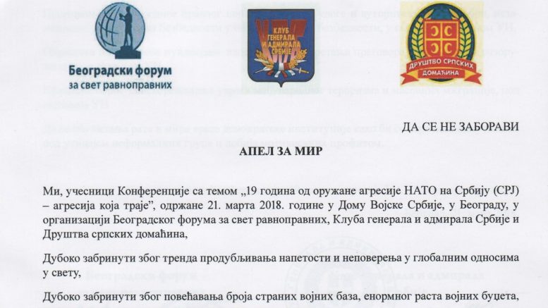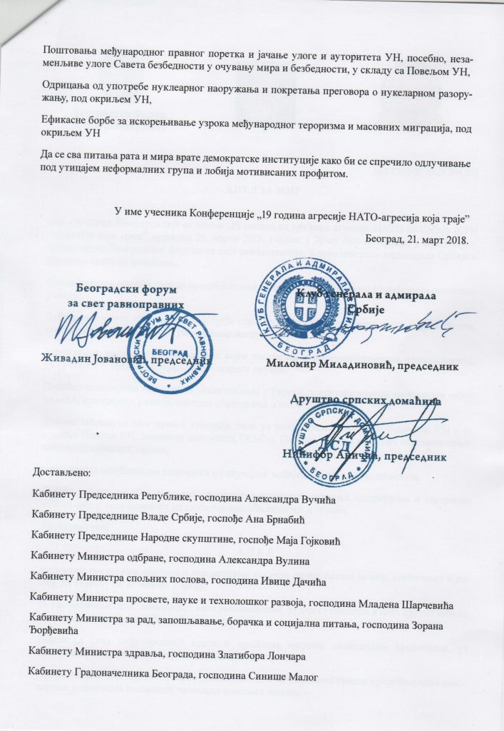 Ми, учесници Конференције са темом „19 година од оружане агресије НАТО на Србију (СРЈ) – агресија која траје“, одржане 21. марта 2018. године у Дому Војске Србије, у Београду, у организацији Београдског форума за свет равноправних, Клуба генерала и адмирала Србије и Друштва српских домаћина,