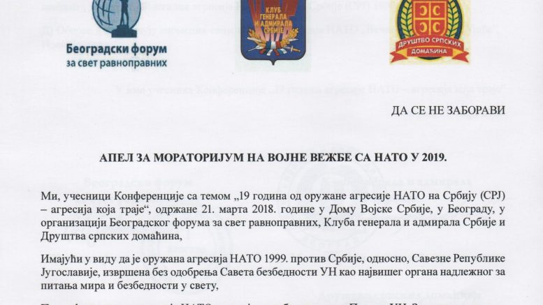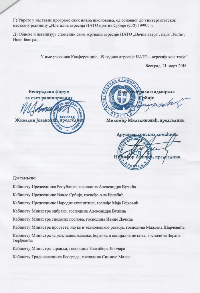 Ми, учесници Конференције са темом „19 година од оружане агресије НАТО на Србију (СРЈ) – агресија која траје“, одржане 21. марта 2018. године у Дому Војске Србије, у Београду, у организацији Београдског форума за свет равноправних, Клуба генерала и адмирала Србије и Друштва српских домаћина