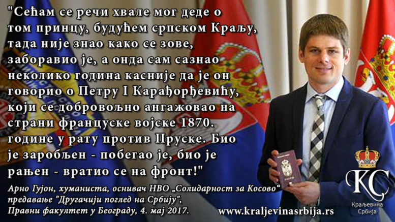ЦИТАТИ О МОНАРХИЈИ – Арно Гујон Posted By: Maja Kovacevic 16. мај 2017. Арно Гујон, хуманиста, оснивач НВО „Солидарност за Косово“; предавање „Другачији поглед на Србију“, Правни факултет Универзитета у Београду, 4. мај 2017.