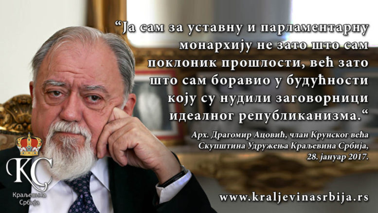 ЦИТАТИ О МОНАРХИЈИ – Драгомир Ацовић Posted By: Maja Kovacevic 7. фебруар 2017. Арх. Драгомир Ацовић, члан Крунског већа, из говора на Скупштини Удружења Краљевина Србија, 28. јануар 2017.