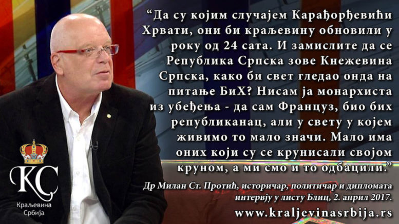 ЦИТАТИ О МОНАРХИЈИ – Милан Ст. Протић Posted By: Maja Kovacevic 5. мај 2017. Др Милан Ст. Протић – историчар, политичар и дипломата; интервју у листу „Блиц“, 2. април 2017. године.