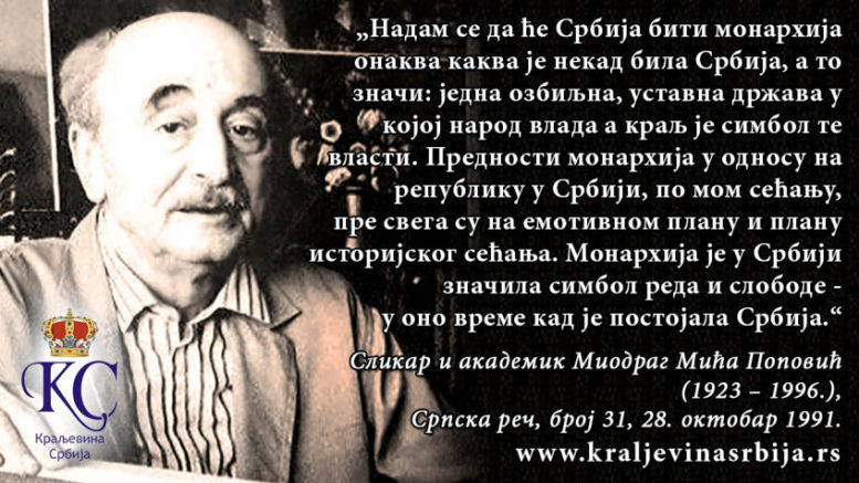 Цитати о монархији – Миодраг Мића Поповић Posted By: Maja Kovacevic 29. септембар 2016. Сликар и академик Миодраг Мића Поповић (1923 – 1996.), Српска реч, број 31, 28. октобар 1991.