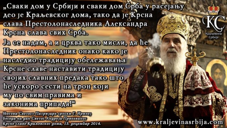 ЦИТАТИ О МОНАРХИЈИ – ПАТРИЈАРХ ИРИНЕЈ Posted By: Maja Kovacevic 9. октобар 2016. Цитат из беседе Његове Светости Патријарха српског г. Иринеја на Крсној слави Краљевског дома, 13. децембра 2014.