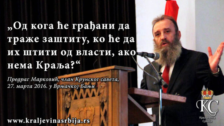 Цитати о монархији – Предраг Марковић Posted By: Maja Kovacevic 27. октобар 2016. Г. Предраг Марковић, председник Народне скупштине од 2004. до 2007, књижевник, члан Крунског савета, 27. марта 2016. у Врњачкој Бањи