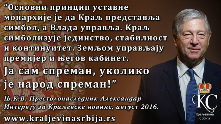 Цитати о монархији – Престолонаследник Александар Posted By: Maja Kovacevic 31. август 2016. Цитат Њ.К.В. Престолонаследник Александар из интервјуа за „Краљевске новине“, август 2016.