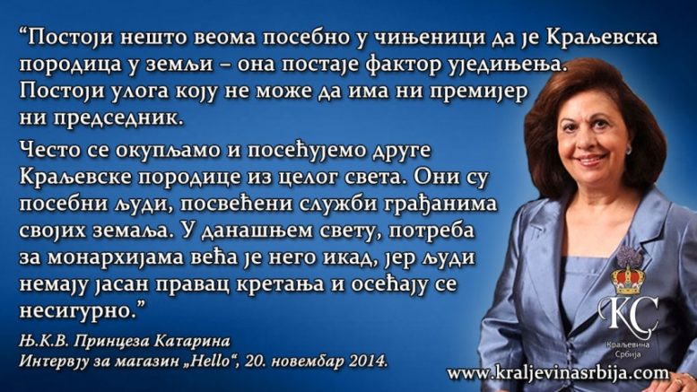 ЦИТАТИ О МОНАРХИЈИ – ПРИНЦЕЗА КАТАРИНА Posted By: Maja Kovacevic 26. август 2016. Цитат Њ.К.В. Принцезе Катарине из интервјуа за магазин „Hello“, издање за Блиски исток, од 20. новембра 2014.