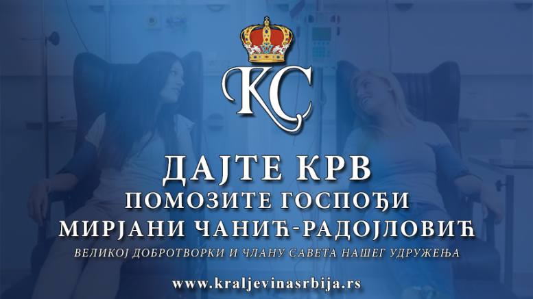 Удружење Краљевина Србија позива све чланове, симпатизере, као и све хумане људе да се укључе у акцију ДАВАЊА КРВИ за операцију госпође Мирјане Чанић-Радојловић.