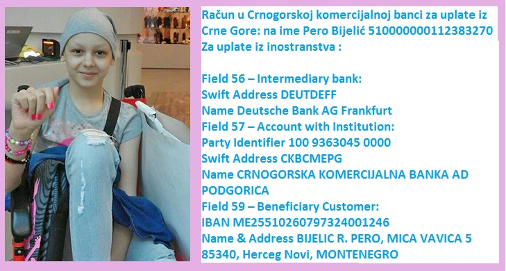 Једанаестогодишња Ива Бијелић, ученица вјеронауке из Херцег Новог, оболела је од саркома (карцинома костију) и налази се у специјалној педијатријској клиници у Штутгарту.
