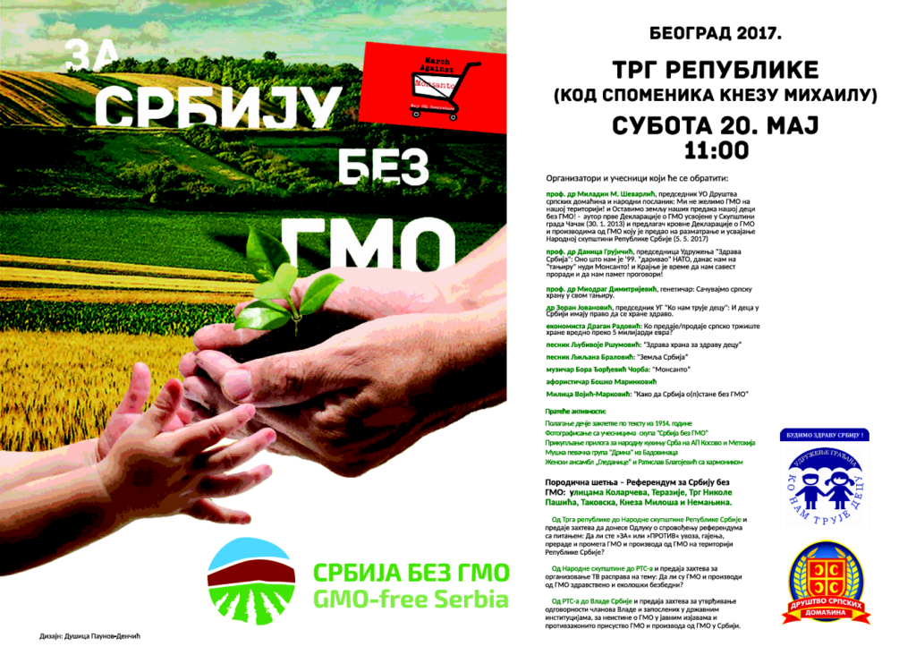 У складу са усвојеном Декларацијом о ГМО и поводом „Марша против Монсанта“ – који се треће суботе у мају организује сваке године у свим земљама света, Друштво српских домаћина, у сарадњи са другим невладиним и нестраначким организацијама, у суботу, 20. маја, са почетком у 11 часова, на Тргу републике у Београду, организује ЈАВНИ СКУП У ПОКРЕТУ под називом СРБИЈА БЕЗ ГМО.