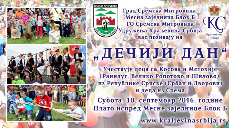 Градски одбор Сремска Митровица Удружења Краљевина Србија вас са поносом позива на традиционалну манифестацију „Дечији дан“, која ће се ове године одржати у суботу, 10. септембра 2016. године на платоу испред Месне заједнице Блок Б.