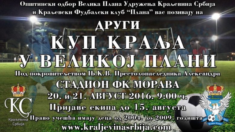 Општински одбор Велика Плана Удружења Краљевина Србија и Краљевски фудбалски клуб „Плана“ вас позивају на фудбалски турнир – други „Куп Краља“.