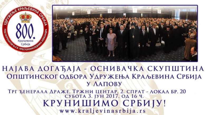 Повереништво Лапово Удружења Краљевина Србија вас позива на оснивачку скупштину Општинског одбора која ће се одржати у суботу 3. јуна 2017. у локалу бр. 20 на другом спрату тржног центра на Тргу ђенерала Драже (ул. Немањина ББ) у Лапову с почетком у 16 часова.