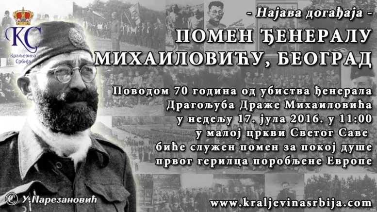 Удружење припадника ЈВуО 1941 – 1945, Републичка асоцијација за неговање тековина Равногорског покрета и Градски одбор Београд Удружења Краљевина Србија вас позивају да поводом 70 година од убиства ђенерала Драгољуба Драже Михаиловића у недељу 17. јула 2016. у 11:00 у малој цркви Светог Саве на Врачару, присуствујете помену за покој душе нашег Чиче.