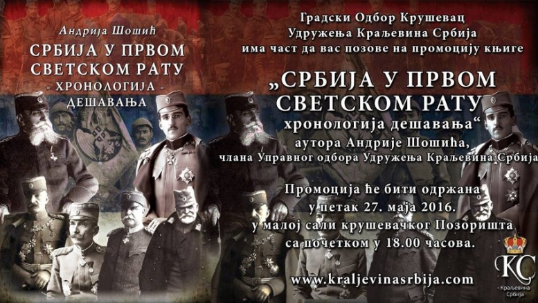 Градски Одбор Крушевац Удружења Краљевина Србија има част да вас позове на промоцију књиге „Србија у Првом светском рату хронологија дешавања“ аутора Андрије Шошића, члана Управног одбора Удружења Краљевина Србија.