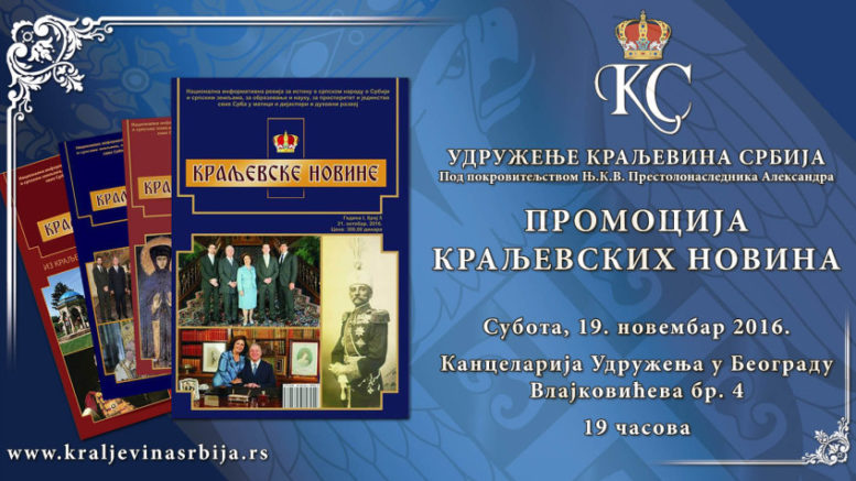 Удружење Краљевина Србија вас позива на промоцију „Краљевских новина“, првог монархистичког магазина у Србији, која ће се одржати у суботу 19. новембра 2016. у канцеларији Удружења у Београду, Влајковићева бр. 4 с почетком у 19 часова.