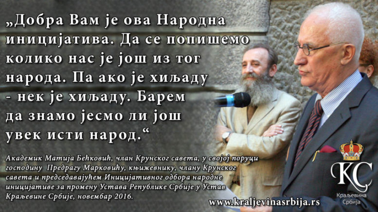 Aкадемик Матија Бећковић, књижевник, члан Крунског савета, у својој поруци господину Предрагу Марковићу, књижевнику, члану Крунског савета и председавајућем Иницијативног одбора народне иницијативе за промену Устава Републике Србије у Устав Краљевине Србије, новембар 2016.