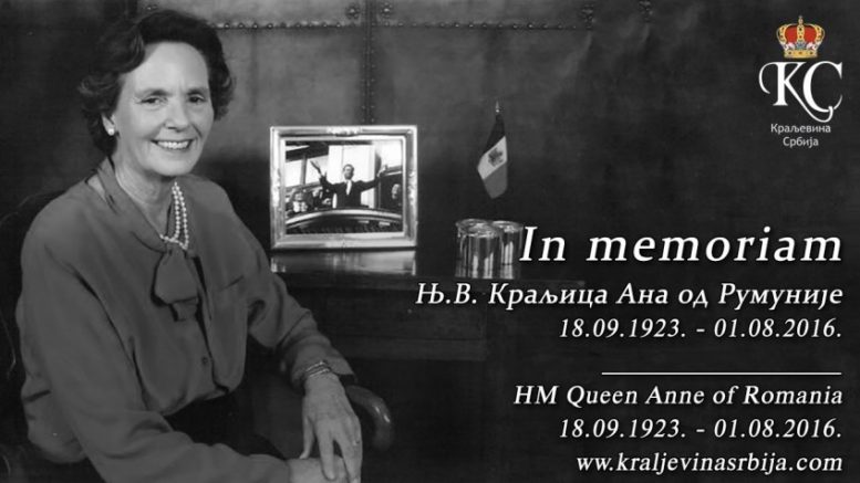 Удружење Краљевина Србија је са тугом и жаљењем примило вест о смрти Краљице Ане, супруге Његовог Величанства Краља Михаја I од Румуније.
