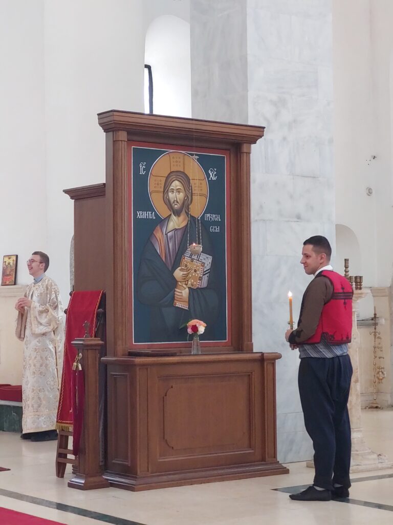 У олтару часне двери украшене лепим криновима.Јеванђеље на средини.Око њих призренски некадашњи парох отац Илија, садашњи отац Јован, игуман манастира Св.Архангела отац Михаило, игуман манастира Бањска отац Данило, проректор призренске Богословије отац Исидор , парох Новопазарски отац Сава, свештеник брезовачки отац Бошко у белим свечаним одорама.За певницама богослови.
