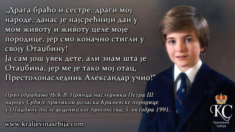 Речи којима се Њ.К.В. Принц наследник Петар III обратио своме народу, приликом доласка Краљевске породице у Отаџбину први пут после деценијског прогонства, 5. октобра 1991.