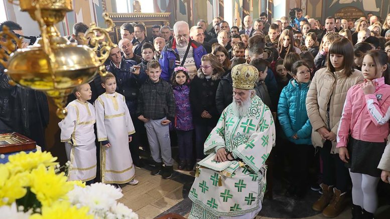 Славски колач преломио је Патријарх српски г. Иринеј са кумом данашње славе храма г. Драганом Вучичевићем и његовом породицом.